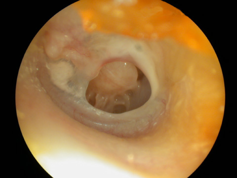 تصویر نشان میدهد ، گوش دچار پارگی پرده و چسبندگی استخوانچه های گوش میانی است.